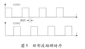 該電路主要由勵(lì)磁時(shí)序發(fā)生單元、三態(tài)緩沖器及隔離光耦組成。勵(lì)磁時(shí)序由冷凍鹽水流量計(jì)系統(tǒng)的控制核心產(chǎn)生。采用DSP的EPWM外設(shè)模塊,通過(guò)設(shè)定其內(nèi)部定時(shí)器的工作模式發(fā)出所要求的勵(lì)磁頻率的勵(lì)磁時(shí)序PWM信號(hào)CT_1和CT_2。由于勵(lì)磁控制系統(tǒng)中的勵(lì)磁工作電源的電壓要比DSP的工作電源電壓高得多,為防止勵(lì)磁電路故障對(duì)系統(tǒng)控制核心產(chǎn)生致命影響,采用光耦將控制部分與勵(lì)磁部分進(jìn)行隔離。另外,由于DSP引腳的驅(qū)動(dòng)能力有限,所以在DSP與隔離光耦之間加入三態(tài)緩沖器以驅(qū)動(dòng)隔離光耦的輸入級(jí)。并且,DSP能夠通過(guò)GPIO口控制三態(tài)緩沖器上的使能引腳來(lái)使能和禁止勵(lì)磁,以在檢測(cè)到電路故障時(shí)迅速關(guān)斷H橋所有橋臂。該勵(lì)磁時(shí)序產(chǎn)生電路通過(guò)軟件編程可產(chǎn)生如圖5所示的單頻矩形波。在實(shí)際應(yīng)用中,由于組成H橋的達(dá)林頓三極管與MOS管導(dǎo)通與關(guān)斷的時(shí)間不一致,易在勵(lì)磁方向切換瞬間,產(chǎn)生上下橋臂同時(shí)導(dǎo)通的現(xiàn)象,反映在勵(lì)磁電流波形上為一幅值很高的窄脈沖。該脈沖電流不僅容易引起遲滯比較電路的誤輸出,從而導(dǎo)致高低壓切換電路與電流旁路電路的誤動(dòng)作,而且對(duì)恒流控制電路產(chǎn)生沖擊,減小三端穩(wěn)壓芯片的使用壽命,同時(shí)還會(huì)產(chǎn)生EMC電磁干擾,給測(cè)量精度帶來(lái)影響。所以實(shí)際應(yīng)用時(shí),如圖5所示對(duì)方波勵(lì)磁時(shí)序添加死區(qū),可以明顯減小上述現(xiàn)象。