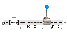 流量調(diào)節(jié)閥或壓力調(diào)節(jié)閥盡量安裝在傳感器的下游5D以遠(yuǎn)處,若必須安裝在傳感器的上游,傳感器上游應(yīng)有不小于50D的等徑直管段,下游應(yīng)有不小于5D的等徑直管段。