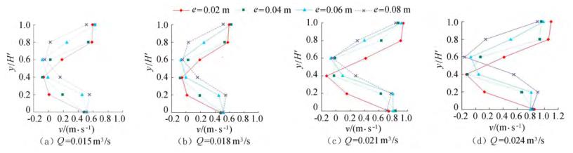 由圖5可知,當e相同時,斷面*小流速發(fā)生的位置相同,發(fā)生在浮體結構下游回流區(qū)位置。隨著來流流量的增大,流經浮體結構下泄的水流流速在上層和下層水體中呈現增大的趨勢。浮體結構位置不變,由于受到浮體結構的擠壓,上游來流分別經過浮體結構上部、下部進行泄流,因此在下游區(qū)域的上層、下層水體中,流速較大;受浮體結構的阻擋,浮體結構下游區(qū)域形成回流區(qū),流速較小。試驗過程中,由于控制浮體結構所在水域的上游、下游水位不發(fā)生變化,因此隨著來流流量的增大,流速呈現增大的趨勢。