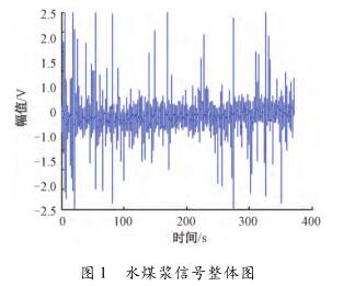 針對硅酸鈉流量計測量水煤漿時出現(xiàn)較大波動,甚至回零這一問題,特去某煤化工企業(yè)甲醇分公司進行現(xiàn)場數(shù)據(jù)采集。該公司所使用的對置式四噴嘴氣化有4個噴嘴,噴嘴管道口徑為125mm,管中水煤漿流量基本穩(wěn)定在19m³/h(流速約為0.48m/s)。每條噴嘴煤漿線上安裝了3臺硅酸鈉流量計,每臺硅酸鈉流量計由傳感器和變送器兩部分組成。選擇其中1條水煤漿管線上的1臺硅酸鈉流量計進行數(shù)據(jù)采集,因為該臺硅酸鈉流量計測量結(jié)果波動大,甚至出現(xiàn)回零的現(xiàn)象。將課題組研制的基于DSP的電磁流量變送器的信號線和勵磁線接到該電磁流量傳感器的電極和勵磁線圈上,組合成完整的硅酸鈉流量計,進行水煤漿數(shù)據(jù)采集。使用的電磁流量變送器是以TI公司DSP芯片TMS320F28335為核心,采用高頻勵磁方案,其硬件主要包括勵磁控制系統(tǒng)和信號采集處理系統(tǒng),具體的模塊有勵磁驅(qū)動模塊、信號調(diào)理采集模塊、信號處理控制模塊、人機接口模塊、通信模塊及電源管理模塊。信號調(diào)理采集模塊中的調(diào)理電路對一次儀表輸出的信號進行放大和濾波,截止頻率是2kHz,放大倍數(shù)約為230倍。通過NI公司USB-6216型號的數(shù)據(jù)采集卡進行數(shù)據(jù)采集,把調(diào)理電路的輸出端連接到數(shù)據(jù)采集卡的一個差分輸入端,并設(shè)置數(shù)據(jù)采集卡工作在差分的測量模式,設(shè)置采集卡的采樣頻率為10kHz。采集多組水煤漿信號數(shù)據(jù),每組數(shù)據(jù)的時間長度為5min。