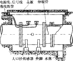 由于大口徑管道在多數(shù)場合下是埋在地下的,因此大口徑傳感器在安裝前應(yīng)做好水泥地坑。圖6-19所示是在給排水系統(tǒng)中常見的安裝形式。水泥地坑應(yīng)有足夠的活動空間,側(cè)壁埋有敷設(shè)電纜的鋼管,上有蓋板防止雨淋,下有泄水管以免坑內(nèi)積水而使傳感器侵水。為了拆裝方便,傳感器應(yīng)放在墊腳上,且在下游側(cè)裝有活絡(luò)的伸縮管。圖6-20是熱水流量計在地下水泥管污水排放系統(tǒng)中的安裝實例。