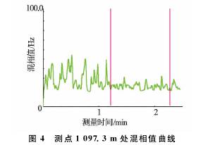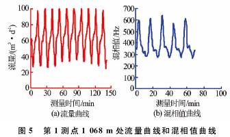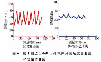 T-××-××1井是大慶油田采油五廠1口水驅(qū)產(chǎn)出井,采用阻抗式含水率計(jì)在該井進(jìn)行了測試。圖3、圖4分別為測點(diǎn)深度1097.3m測量的流量及混相值曲線圖。2min的采樣時(shí)間內(nèi),流量及混相值曲線波動(dòng)劇烈,明顯受井下產(chǎn)氣影響,進(jìn)行平均值計(jì)算時(shí)只能取后半段較平穩(wěn)的數(shù)據(jù),因此,測試時(shí)需延長測量時(shí)間。錄取不同范圍數(shù)值時(shí)流量及含水率測量差值較大,流量平穩(wěn)段為14.81m3/d,高值時(shí)達(dá)到23.52m3/d;取不同測量段的混相值時(shí)測量含水率*大相差12%。重復(fù)測量得到了相同的測量結(jié)果。由此可見,氣體對流量及含水率測量產(chǎn)生了非常大的測量誤差。