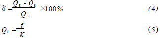 將過熱蒸汽流量計(jì)在標(biāo)準(zhǔn)水裝置上,分別用頻譜分析和脈沖計(jì)數(shù)的方法進(jìn)行標(biāo)定,流體介質(zhì)為水未加氣體,采用的標(biāo)準(zhǔn)傳感器為精度等級為0.2級的電磁流量計(jì)。在每個(gè)流量測量點(diǎn)上的儀表系數(shù)用公式(1)計(jì)算,然后用式(2)計(jì)算得到*終儀表系數(shù)K。Ql為被測水的流量值,f為每一個(gè)流量點(diǎn)得到的頻率,k為每個(gè)測量點(diǎn)得到的儀表系數(shù)。kmax、kmin分別為試驗(yàn)流量范圍內(nèi)得到的*大與*小的儀表系數(shù)。儀表系數(shù)的線性度E1用式(3)來計(jì)算。