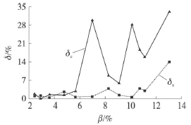 將試驗(yàn)數(shù)據(jù)進(jìn)行處理,得到了過熱蒸汽流量計(jì)測量誤差隨氣相含率變化的情況,如圖5所示。其中δs為譜分析方法的測量誤差,δc為脈沖計(jì)數(shù)方法的測量誤差。過熱蒸汽流量計(jì)的測量誤差用式(4)來計(jì)算。其中Qs為裝置中標(biāo)準(zhǔn)表測量出的管道總流量,Qt為試驗(yàn)管段中過熱蒸汽流量計(jì)的測量值。將譜分析和脈沖計(jì)數(shù)得到的頻率值和儀表系數(shù)分別代入式(5)計(jì)算Qt值。從圖中可以看出氣相含率的增加兩種測量方法得到的誤差并不相同。當(dāng)含氣率不高時(shí),0<β<6%,譜分析法的平均誤差為1.226%,*大誤差為2.687%,脈沖計(jì)數(shù)法的平均誤差為1.583%,*大誤差為2.898%,因此譜分析法與脈沖計(jì)數(shù)法的測量誤差區(qū)別不大,譜分析沒有明顯的優(yōu)勢;在氣相含率進(jìn)一步增加時(shí),6%<β<14%,譜分析法的平均誤差為3.975%,*大誤差為14.058%,脈沖計(jì)數(shù)法的平均誤差為20.053%,*大誤差為33.130%,脈沖計(jì)數(shù)的方法得到的測量誤差遠(yuǎn)大于譜分析方法。