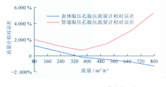 從以上數(shù)據(jù)表和曲線圖中可以看出:空氣流量計(jì)型號(hào)一定的情況下,用表體取壓孔取壓方式檢定流量計(jì)時(shí)流量計(jì)的線性度較好,用管道取壓孔取壓方式檢定流量計(jì)時(shí)流量計(jì)的線性度較差;流量測(cè)點(diǎn)相同的情況下,表體取壓孔取壓檢定方式的流量計(jì)誤差較小,管道取壓孔取壓檢定方式的流量計(jì)誤差較大;兩種取壓方式引起的誤差隨著流量的增大而逐漸增大,在流量為2?。梗埃埃恚常钑r(shí)兩者相差近6.2%,遠(yuǎn)遠(yuǎn)超出了流量計(jì)的準(zhǔn)確度等級(jí)。所以,在空氣流量計(jì)的檢定過程中,應(yīng)避免在流量計(jì)表體取壓孔以外的地方取壓進(jìn)行檢定。