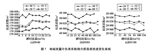 由圖1可得:( 1)隨著介質(zhì)溫度的升高,水處理流量計的儀表系數(shù)均呈逐漸降低的趨勢。其中20℃和50℃的儀表系數(shù)基本相同,10℃和80 0C的儀表系數(shù)與20℃時偏離較大。(2)溫度對水處理流量計的儀表系數(shù)在高溫以及低溫處影響明顯,以D N40水處理流量計為例,儀表系數(shù)本次實驗高低溫處*大變化量約為0. 7% o ( 3)在水處理流量計相應(yīng)的流量范圍內(nèi),在同一溫度下,隨著介質(zhì)流速的變化,水處理流量計的儀表系數(shù)在個別點(diǎn)出現(xiàn)略微浮動,但整體變化不超過1 0. 2 %。