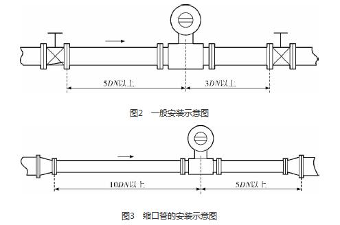 污水處理廠進(jìn)水流量計(jì)的安裝質(zhì)量對其測量結(jié)果的影響較大,因此在安裝時(shí)需要注意幾個(gè)問題。*先,污水處理廠進(jìn)水流量計(jì)直管段的選擇在配管時(shí)一定要按照要求進(jìn)行選擇,一般選擇流量計(jì)通徑與工藝管道通徑相同,即可滿足工程需要,而且安裝方便、壓力損失小,流量計(jì)直管段上游側(cè)的長度不少于5倍工藝管道直徑,下游側(cè)的長度不少于3倍工藝管道直徑(圖2)。但在流速太慢而又要求精度較高或需要變徑的應(yīng)用場合,可選擇通徑小于工藝管道通徑的流量計(jì),以提高測量精度,此時(shí)流量計(jì)上、下游必須加裝異徑管,且進(jìn)口異徑管上游側(cè)應(yīng)有長于10倍工藝管道直徑的直管段,下游側(cè)應(yīng)有長于5倍工藝管道直徑的直管段(圖3)。