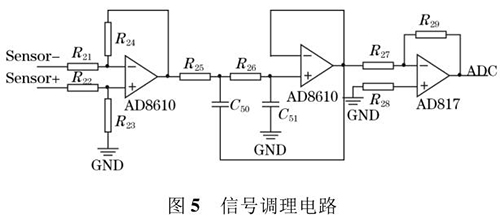 如圖4 所示,信號調(diào)理電路由前置放大電路、濾波電路以及二次放大電路組成。其中前置放大電路主要是由 AD8610 組成的差分放大電路構(gòu)成,其主要是去除信號中的共模干擾并且進(jìn)行*一次前置放大,前置放大電路的放大倍數(shù)為 15。由于有效信號的幅值很小,經(jīng)過前置放大電路后信號中還存在很多高頻雜波,這些雜波會影響對后級信號的處理,因此還需要對前置放大電路輸出的信號進(jìn)行低通濾波和二次放大。系統(tǒng)選用二階有源低通濾波電路濾除信號中的高頻干擾,低通濾波的截止頻率設(shè)定在 6 kHz 左右,選用 AD817 組成的二次放大電路對濾波電路輸出的信號進(jìn)行二次放大,將信號調(diào)理電路輸出的信號調(diào)整在 0~5 V 之間,*終利用 DSP 內(nèi)部的 AD 轉(zhuǎn)換器對此信號進(jìn)行模數(shù)轉(zhuǎn)換得出傳感器線圈輸出的感應(yīng)電動勢,從而根據(jù)相關(guān)的公式計(jì)算得出管道中液體的流量。具體電路圖如圖 5 所示。