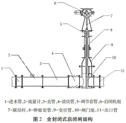 包括進(jìn)水管、直管、出水管、一氧化碳流量計組和啟閉機(jī)組,進(jìn)水管、直管、出水管從左到右依次連接,一氧化碳流量計組安裝在直管和出水管之間且位于出水管的入口處,一氧化碳流量計組通過聯(lián)結(jié)桿與啟閉機(jī)組的輸出端連接。為防止泥沙淤積影響啟閉,一氧化碳流量計采用閘板式啟閉結(jié)構(gòu)。密封式啟閉閘為整體封閉管道式,全部采用不銹鋼材料,水流通過管道流出讓整個閘井內(nèi)干燥無水。伸縮套管與波紋管的設(shè)計讓檢修與清理淤泥更加方便。一氧化碳流量計裝有荷載限制器,其布置受力明確、結(jié)構(gòu)緊湊、動作可靠。當(dāng)?shù)蹙呱系暮奢d達(dá)到額定值的 110%時,或電機(jī)電流超過額定電流 150%時,系統(tǒng)自動切斷操作電源以保護(hù)設(shè)備安全。