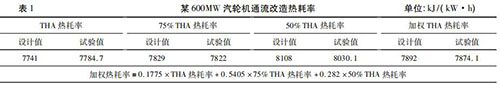 隨著火電機(jī)組利用小時(shí)數(shù)降低,發(fā)電企業(yè)一般都會(huì)根據(jù)不同負(fù)荷工況下的實(shí)際運(yùn)行小時(shí)數(shù),確定機(jī)組熱耗率考核權(quán)重,形成*終的加權(quán)熱耗率考核值??己思訖?quán)熱耗率對(duì)設(shè)備廠家末級(jí)葉片選型、高壓調(diào)門與高壓缸匹配性提出了更高的要求,在當(dāng)前負(fù)荷率偏低的情況下增強(qiáng)了發(fā)電企業(yè)的競(jìng)爭(zhēng)力。然而,僅僅對(duì)加權(quán)熱耗率進(jìn)行考核是不夠的,設(shè)備廠家為了增強(qiáng)自身的競(jìng)爭(zhēng)力,往往會(huì)把全部重點(diǎn)放在如何降低占比大的低負(fù)荷熱耗率上而犧牲高負(fù)荷的熱耗率,這無疑削弱了發(fā)電企業(yè)的適應(yīng)性。某廠一臺(tái) 600MW 汽輪機(jī)通流改造時(shí)僅對(duì)加權(quán)熱耗率進(jìn)行考核,THA 熱耗率要高出設(shè)計(jì)值43. 7 kJ/( kW·h) ,詳見表 1。通流改造時(shí)既要對(duì)加權(quán)熱耗率進(jìn)行考核,也要對(duì) THA工況時(shí)熱耗率進(jìn)行考核。