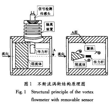 不斷流渦街同樣是以卡門渦街原理為依據(jù)測(cè)量流體流速的,但不斷流渦街表體已經(jīng)在結(jié)構(gòu)上有了質(zhì)的改變。如圖1所示,它將普通渦街單一的信號(hào)檢測(cè)傳感頭改變?yōu)閭髁U與信號(hào)檢測(cè)傳感頭兩部分,并通過隔離裝置完全隔離。當(dāng)表體中流過流體并產(chǎn)生漩渦時(shí),由傳力桿檢測(cè)漩渦的變化,并以力的形式傳遞給信號(hào)檢測(cè)傳感頭,完成了力信號(hào)到電信號(hào)的轉(zhuǎn)換過程。雖然傳力桿與流體直接接觸,但其本身只是進(jìn)行力傳輸?shù)母軛U,因此,只對(duì)外形尺寸及鋼材選擇上具有要求。而信號(hào)檢測(cè)傳感頭是通過隔離裝置與流體完全密閉隔離的,再加上隔離裝置本身具有的散熱功能,使得信號(hào)檢測(cè)傳感頭的使用溫度要遠(yuǎn)遠(yuǎn)低于流體的實(shí)際溫度,從而有效地提高了普通信號(hào)檢測(cè)傳感頭的可測(cè)介質(zhì)溫度。同時(shí),不斷流渦街在進(jìn)行維修更換信號(hào)檢測(cè)傳感頭時(shí),并不影響工藝管道內(nèi)流體的流動(dòng),真正實(shí)現(xiàn)了信號(hào)檢測(cè)傳感頭的不斷流拆裝維護(hù)。