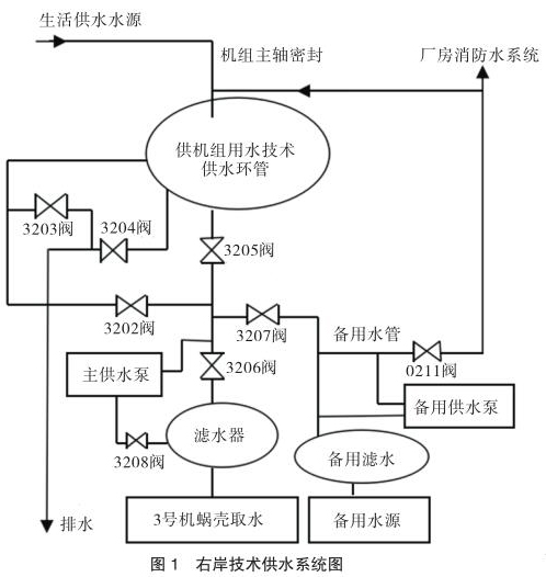 技術(shù)供水系統(tǒng)設(shè)有主、備用水源。主水源是蝸殼取水,作為機(jī)組技術(shù)供水的主用水源。備用水源有兩個(gè),一個(gè)是設(shè)在 1 號(hào)機(jī)段的壩前取水,取水口高程為 145m,另一個(gè)是同 4 號(hào)機(jī)組蝸殼取水共用取水口的蝸殼備用取水。兩路備用水源均接到備用總水管,并通過 X207 閥分別與各臺(tái)機(jī)組的技術(shù)供水系統(tǒng)相連通(見圖 2)。
