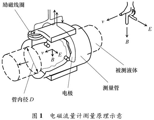 液體流量計的測量原理如圖 1 所示。根據(jù)法拉*電磁感應(yīng)定律,導(dǎo)電液體在磁場中流動會產(chǎn)生電動勢 E,它與磁感應(yīng)強度 B、導(dǎo)電液體平均流速 v 成一定比例關(guān)系: