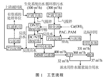 2種廢水在中間水池混勻后,通過泵提升進入保安過濾器,進一步去除細小的懸浮物后經(jīng)過增壓泵進入超濾膜(UF)處理系統(tǒng)和反滲透(RO)系統(tǒng),然后通過渦輪流量計進行計量。反滲透出水直接進入回用水池達標回用,超濾濃水以及反滲透濃水用作水煤漿混合用水。污泥池中的污泥通過泵打入帶式機壓濾處理,濾液自流進入1#調(diào)節(jié)池。工藝流程見圖1。