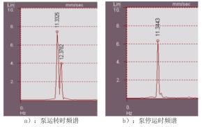 對(duì)振動(dòng)采集器獲取的信號(hào)進(jìn)行譜分析,高溫液體流量計(jì)組運(yùn)轉(zhuǎn)狀態(tài)下主要振動(dòng)頻率為11.33Hz和12.38Hz,其中12.38Hz為高溫液體流量計(jì)轉(zhuǎn)動(dòng)頻率;停運(yùn)時(shí),12.38Hz的高溫液體流量計(jì)轉(zhuǎn)頻消失,11.33Hz的外部激擾力依然存在。