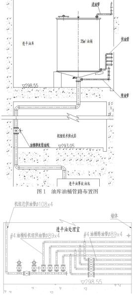 透平油油庫(kù)及油處理室設(shè)置在發(fā)電機(jī)出線層。油庫(kù)中安裝4個(gè)油桶,單個(gè)油桶容積為25m3。按照功能劃分為2個(gè)運(yùn)行油桶,2個(gè)凈油桶。每個(gè)油桶ding部設(shè)置一根油桶進(jìn)油管,油桶下部設(shè)置一根給機(jī)組供油管,油桶底部設(shè)置一根事故排油管,經(jīng)事故排油閥引入事故油池中,事故排油管上引出一根油桶排油管。各油桶的進(jìn)油管、供油管、排油管分別引入油處理室中。具體布置形式可見(jiàn)圖1所示。油處理室中設(shè)置一個(gè)容積為1m3的移動(dòng)油箱,用于向設(shè)備添油或臨時(shí)儲(chǔ)油。