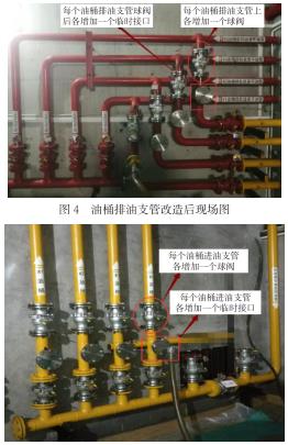 該水電廠在地衣輪機(jī)組檢修結(jié)束后針對(duì)上述弊端,結(jié)合透平油處理室油高壓渦街流量計(jì)布置的現(xiàn)狀,利用無(wú)機(jī)組檢修工作的汛期期間,對(duì)油處理室中油處理高壓渦街流量計(jì)進(jìn)行改造。具體改造內(nèi)容為:將各油桶的進(jìn)油和排油支管球閥后增加設(shè)置相關(guān)的臨時(shí)接口,便于油處理設(shè)備通過(guò)活接頭和軟管直接與各個(gè)油桶單好連接,可不受機(jī)組透平油供油、回油總管的臨時(shí)連接口限制。在支管上增設(shè)的臨時(shí)接口后各增加一個(gè)球閥,以便于將油桶中的油路切斷而進(jìn)行臨時(shí)接頭和軟管的連接。具體改造高壓渦街流量計(jì)效果見(jiàn)圖4、圖5所示。