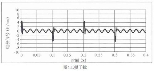 工頻干擾是電磁管道流量計(jì)常見的干擾源。當(dāng)流量計(jì)處于電源形成電磁場中時(shí),由于分布電容的存在,以電磁波的輻射形式干擾電極信號,或者是由供電電源引入的工頻串?dāng)_,工作現(xiàn)場的工頻共模干擾,其產(chǎn)生的物理機(jī)理均是電磁感應(yīng)原理。幅度與流量信號相比,往往要大幾個(gè)數(shù)量級,頻率與供電電源頻率相同。如圖4所示,線圈驅(qū)動頻率為5Hz的電極信號,被耦合了50Hz的工頻干擾,幅度大概相當(dāng)于1feet/s。