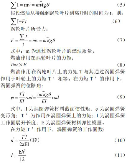 假設(shè)渦輪固定不動,燃油流過渦輪的葉片時將受到阻力,則當(dāng)燃油離開渦輪的葉片時,將產(chǎn)生一個切向動量 mv,這個動量即為渦輪獲得沖量 。