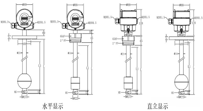 為更直觀地給用戶展現(xiàn)浮球式液位計(jì)的規(guī)格,請參考兩種浮球式液位計(jì)水平顯示以及直立顯示的不同規(guī)格尺寸,如下圖所示: