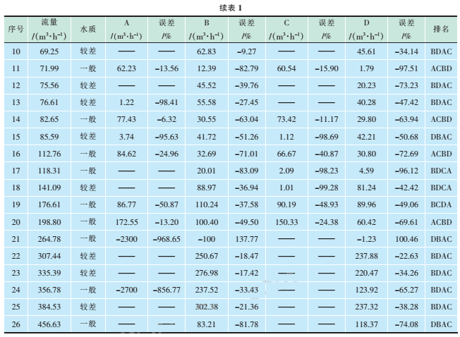 試驗(yàn)數(shù)據(jù)見表1,其中流量表示污水流量計(jì)60min內(nèi)的累計(jì)流量;A、B、C、D分別為4個(gè)型號(hào)的超聲波流量計(jì)在60min內(nèi)的累計(jì)流量;排名為與同一臺(tái)污水流量計(jì)比對(duì)的4臺(tái)超聲波流量計(jì)的誤差按從小到大的順序。
