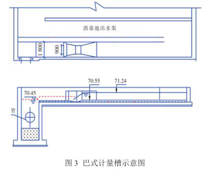 該廠改造后出水經(jīng)二氧化氯消毒后直接排放,為節(jié)省占地,出水明渠與接觸消毒池合建,位于接觸池末端。消毒池出水經(jīng)堰板跌水后通過(guò)2.3米的孔洞180°轉(zhuǎn)彎流入出水計(jì)量明渠。如圖3所示。采用巴式計(jì)量槽+超聲波液位計(jì)測(cè)定流量。