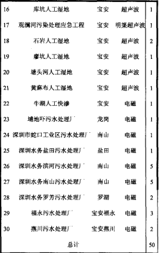 截止目前,深圳市內(nèi)外所有污水處理廠(包括人工濕地、快滲)共計(jì)30余座,重點(diǎn)監(jiān)控的排污流量計(jì)50余臺。統(tǒng)計(jì)數(shù)據(jù)如下表(見表1)